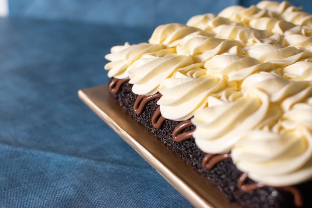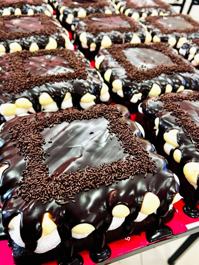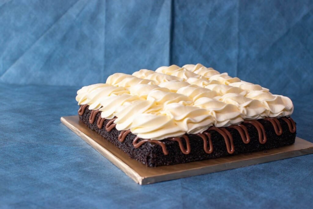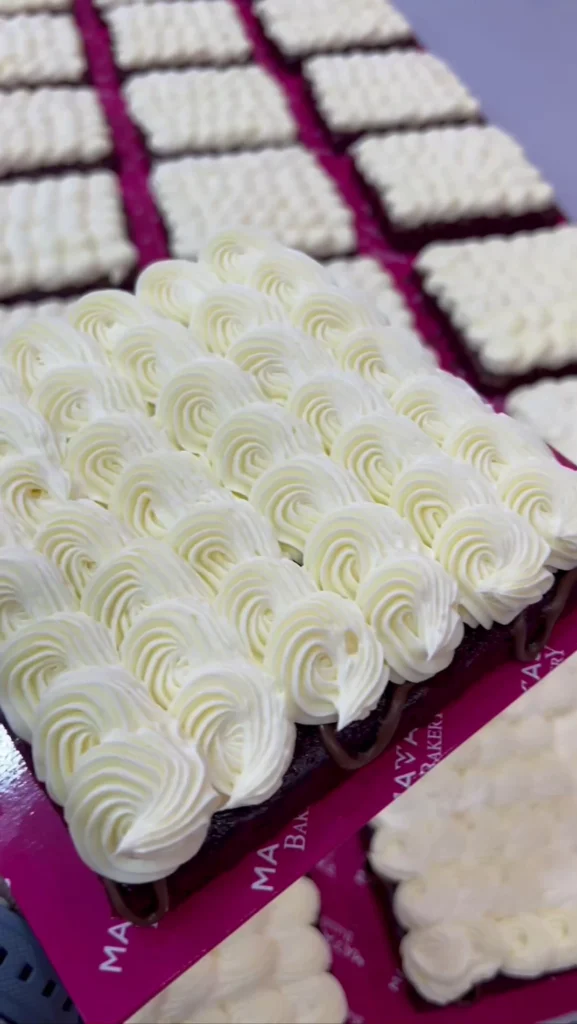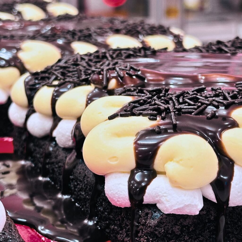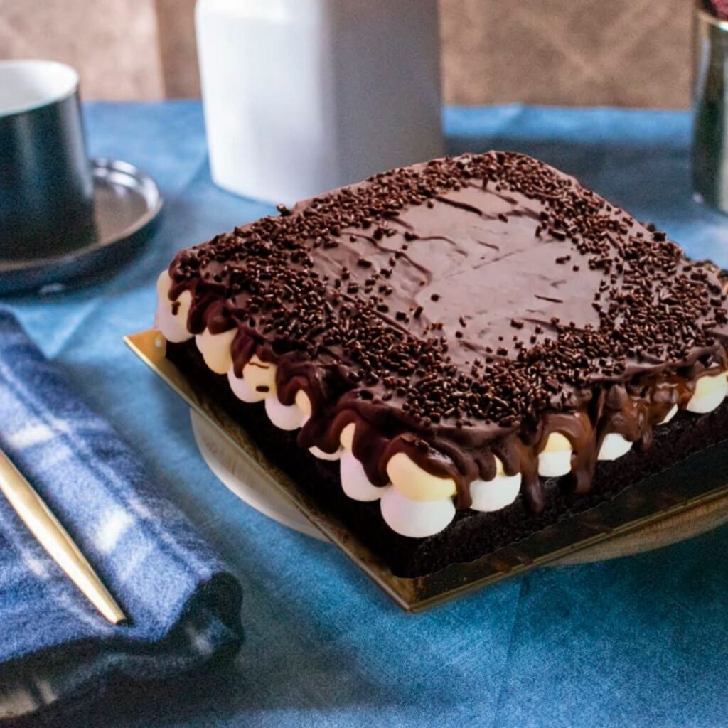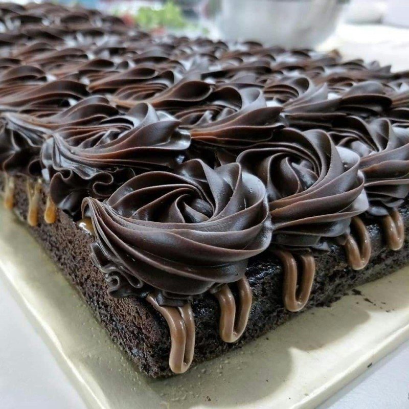 Kek coklat moist yang premium ditopping dengan fresh cream yang dicampur dengan white chocolate, bersama cream cheese dan lelehan coklat ganache yang melimpah. Ditaburi lagi dengan chocolate rize keliling.