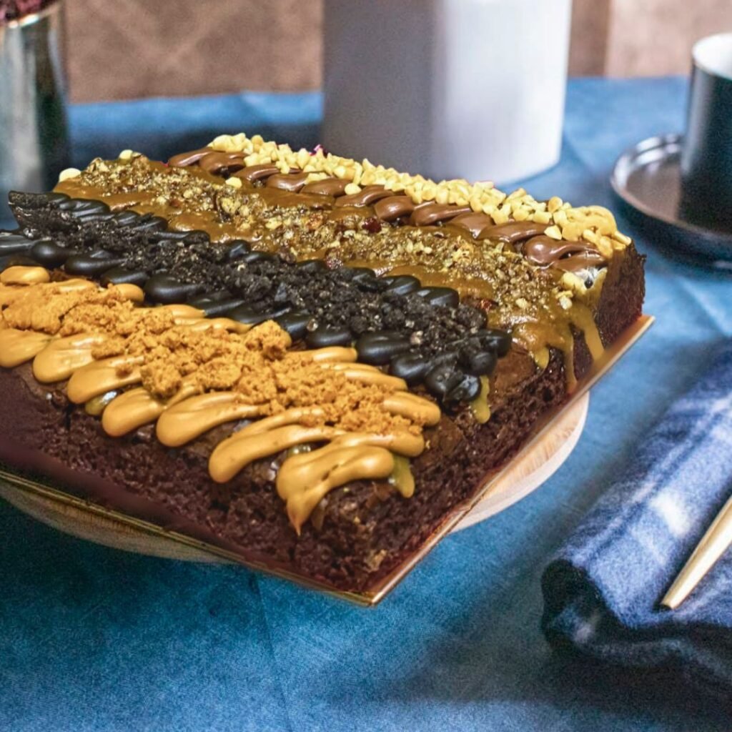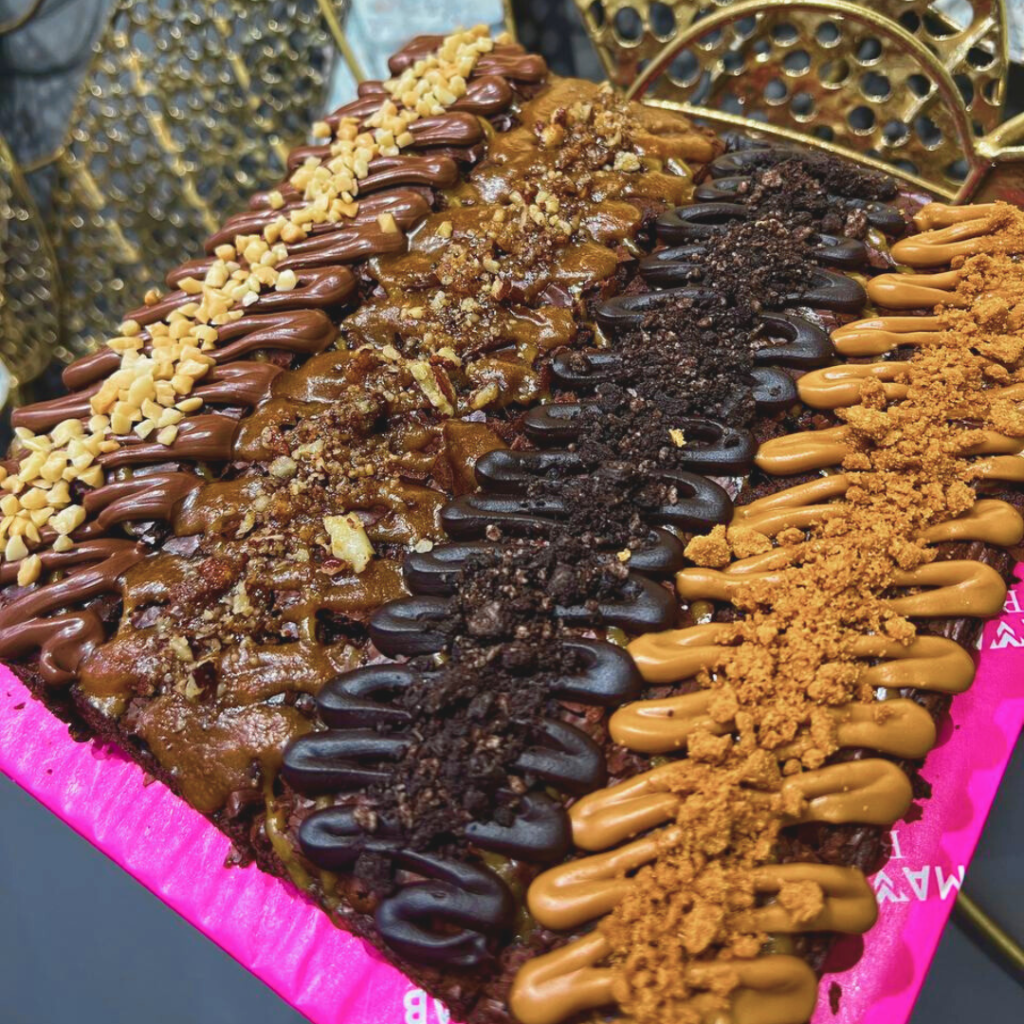 Brownies yang ada 4 topping special – topping almond+nutella; topping salted caramel+kacang pecan; topping choc ganache+crushed oreo & topping biscoff spread+biscoff crumbs. Diperbuat 70% coklat Beryls.