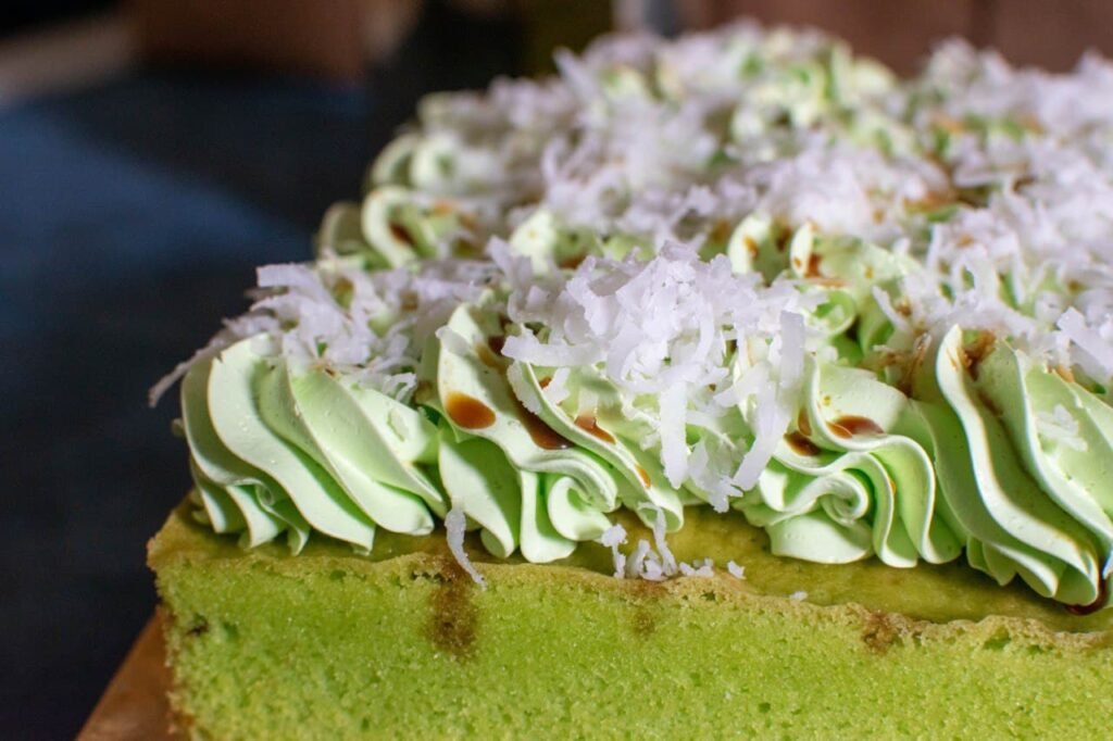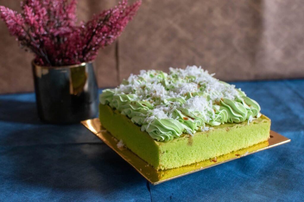 Kek pandan sensasi rasa tradisional lemak² manis – dicotting dengan swiss meringue cream – didrizzle dengan pandan gula melaka sauce – atasnya ditaburi pula dengan Hawaiian Coconut